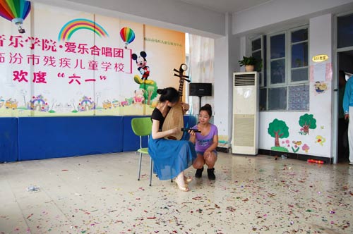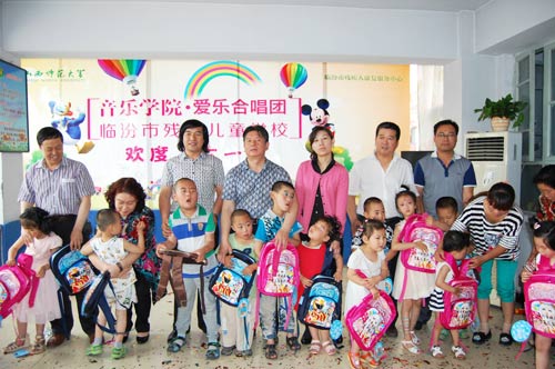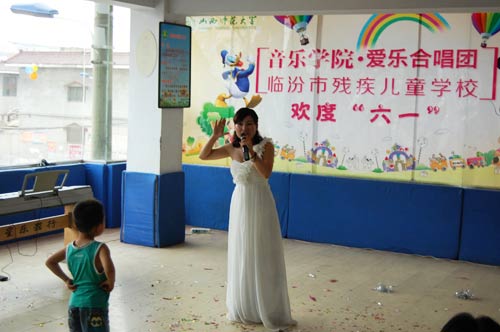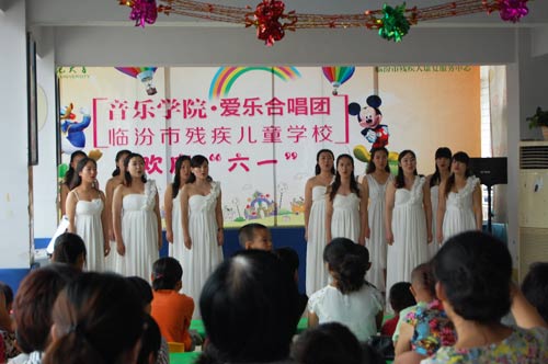 为了贯彻落实省高校工委、校党委《关于开展"学习焦裕禄,争做好公仆"活动的通知》,我院党委积极开展“学习焦裕禄,争做好公仆”“六个一"系列活动。在"六·一"儿童节来临之际,2026世界杯官网党员干部带领爱乐合唱团部分成员于2014年5月31日前往临汾市残疾儿童学校,专程为学校的孩子们送去了精彩的文艺节目和文具用品,与残疾学校的孩子们共同度过了快乐的儿童节。