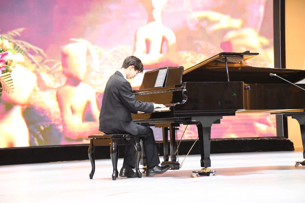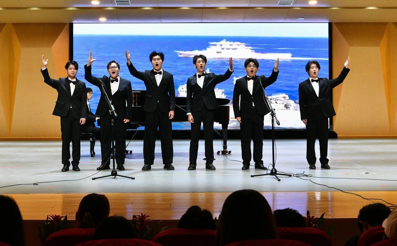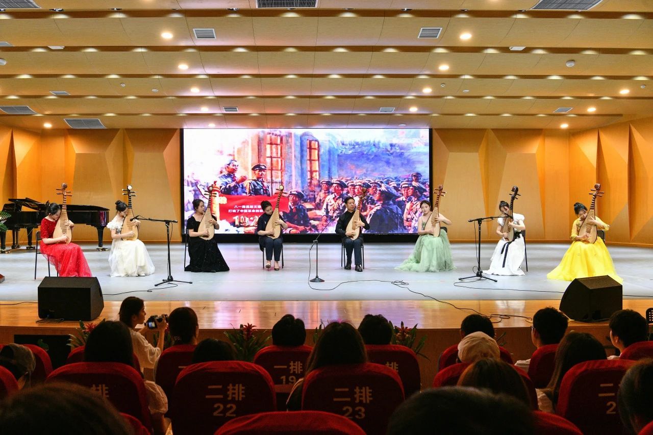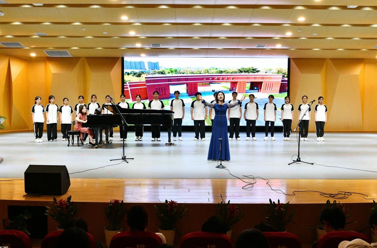 “倾爱国丹心,谱时代华章”篇章将活动推向高潮。爱国情怀是推动教育强国建设的核心动力,钢琴《中国之梦》与合唱《祖国不会忘记》回溯党带领人民奋斗的伟大征程,传递“躬耕教坛,强国有我”的信念与担当。《唱支山歌给党听》从琵琶合奏到全场大合唱,号召学生“将个人理想融入国家发展大局”,铿锵音符点燃了师生心中炽热的爱国赤子心。