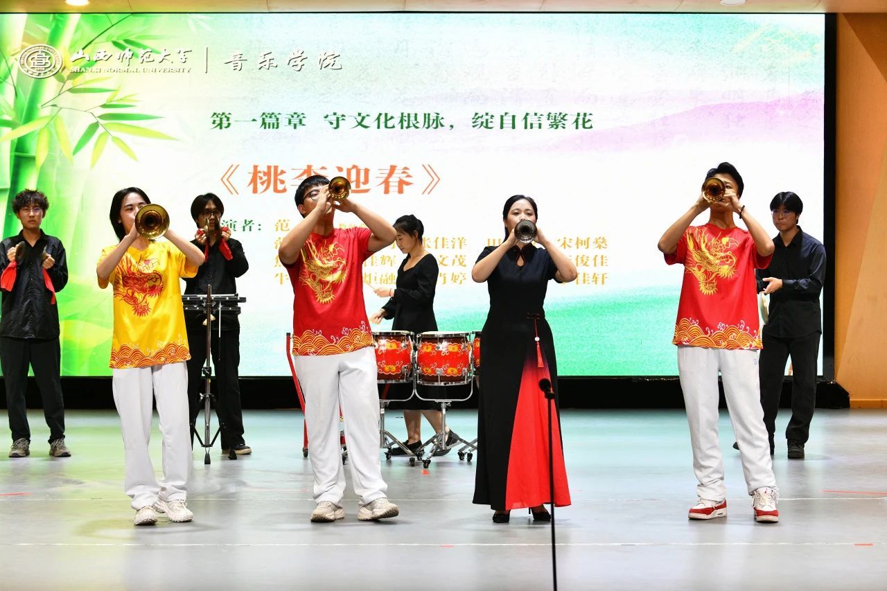 在“守文化根脉,绽自信繁花”篇章中,以“音乐是刻在民族基因里的精神 密码”为引,带领师生回溯历史。吹打乐《桃李迎春》以传统器乐的磅礴气势开场,彰显出师生传承文化根脉的蓬勃生机。婉转的《皮黄》戏曲与展现哈尼族文化轮廓的《努玛阿美》(意为“阳光普照的地方”),让民族根脉在中西音乐交融间绽放自信光芒。笛子合奏《扬鞭催马运粮忙》更让民俗文化在乐声中“活”起来,推动文化自信之花绚丽绽放。