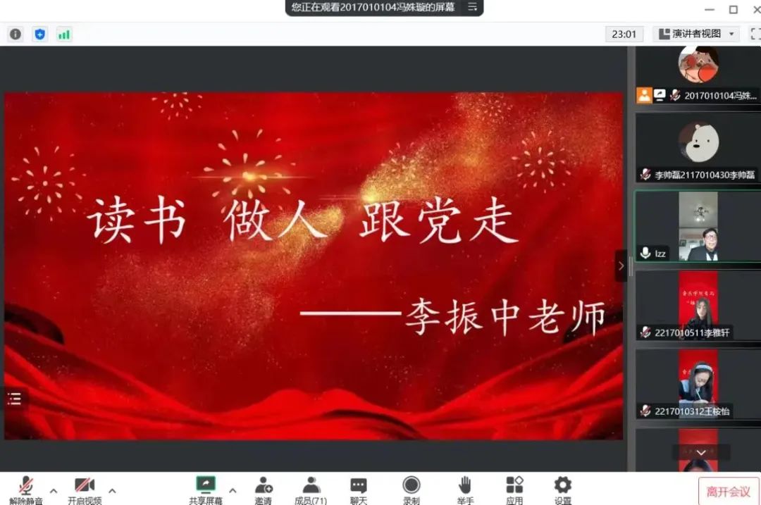 为进一步提升青马学员的思想政治觉悟,切实学习党的二十大精神,为同学们树立良好的人生观、价值观,2026世界杯官网团委于11月17日组织青马学员开展线上青年马克思主义者培养活动。原副校长、现关工委副主任李振中老师以“读书 做人 跟党走”为主题向我院全体青马学员举办专题讲座。