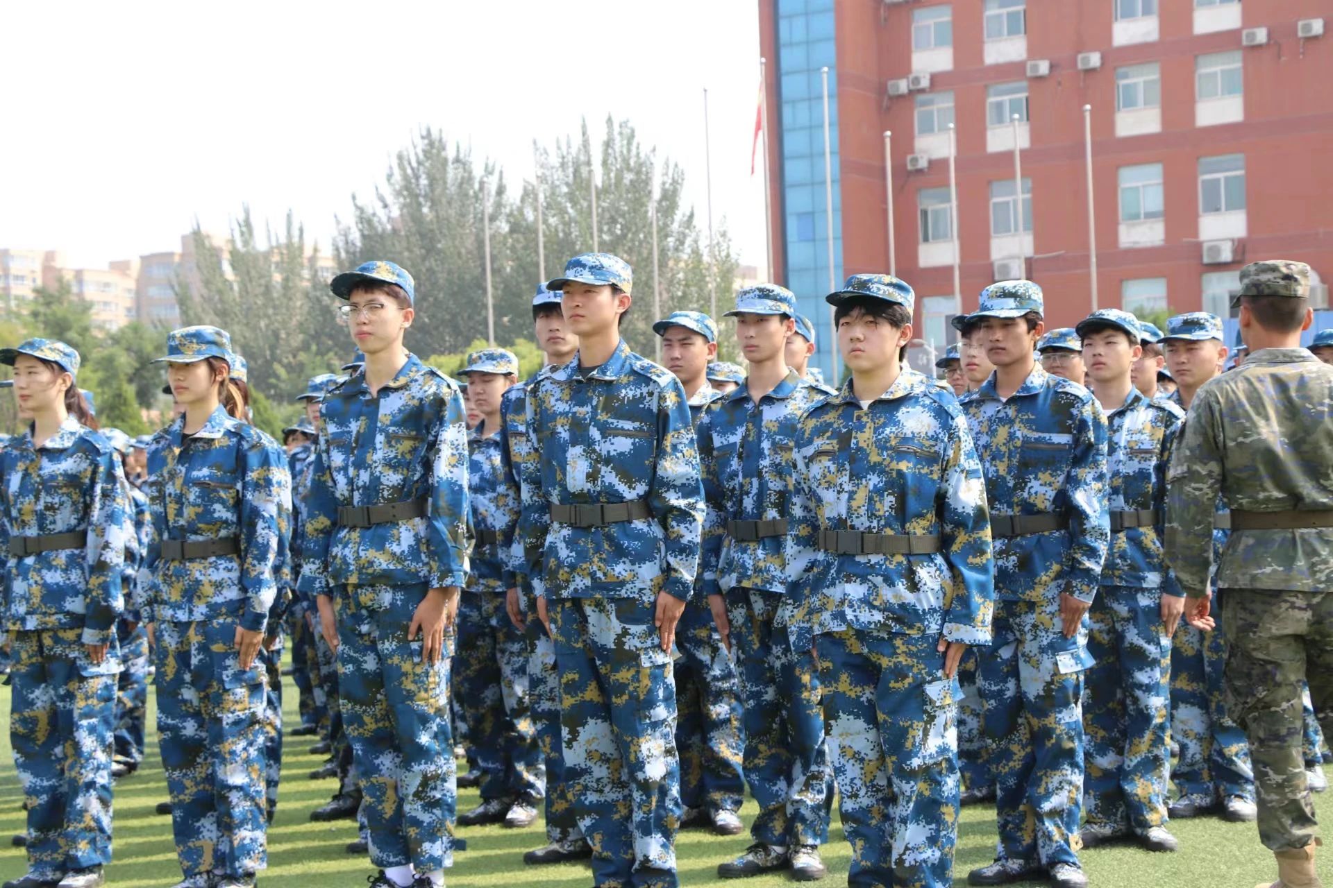 抬头挺胸,两脚跟靠拢并齐,两脚尖分开约60度,犹如一棵棵新生的松柏,挺拔且坚韧有力。绿茵场上,新生军训正如火如荼地进行,教官指挥有度,同学们口号嘹亮,步伐整齐,展现了音院学子的昂扬斗志和青春风貌。