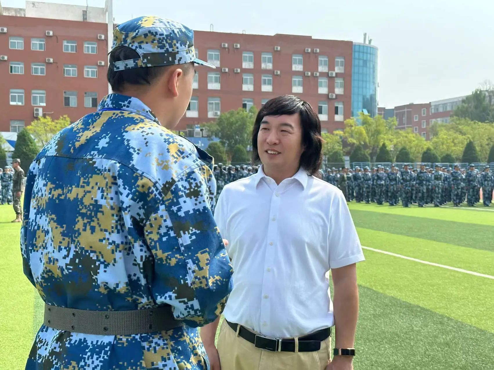 我院领导详细了解了军训进展情况,并走到训练场中间,与承训教官和参训学生进行亲切交流。他对同学们昂扬向上的精神状态和斗志给予了充分肯定,对教官和老师们的辛勤付出表示衷心感谢。