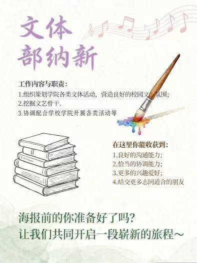 主要负责统筹研究生文体活动,如迎新晚会、校园歌手大赛、体育联赛等;挖掘同学文艺与体育特长,丰富校园文化生活。需要热爱文体、脑洞大开,具备活动策划或执行经验的你。