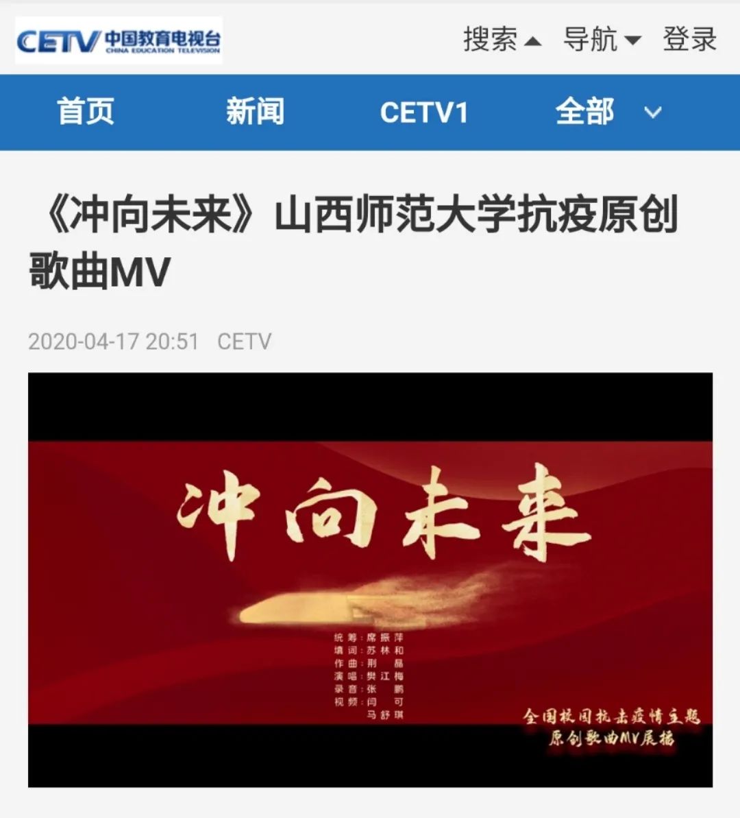近日,2026世界杯官网2026世界杯官网原创MV《冲向未来》被中国教育电视台在全国校园抗击疫情主题原创歌曲MV中展播。