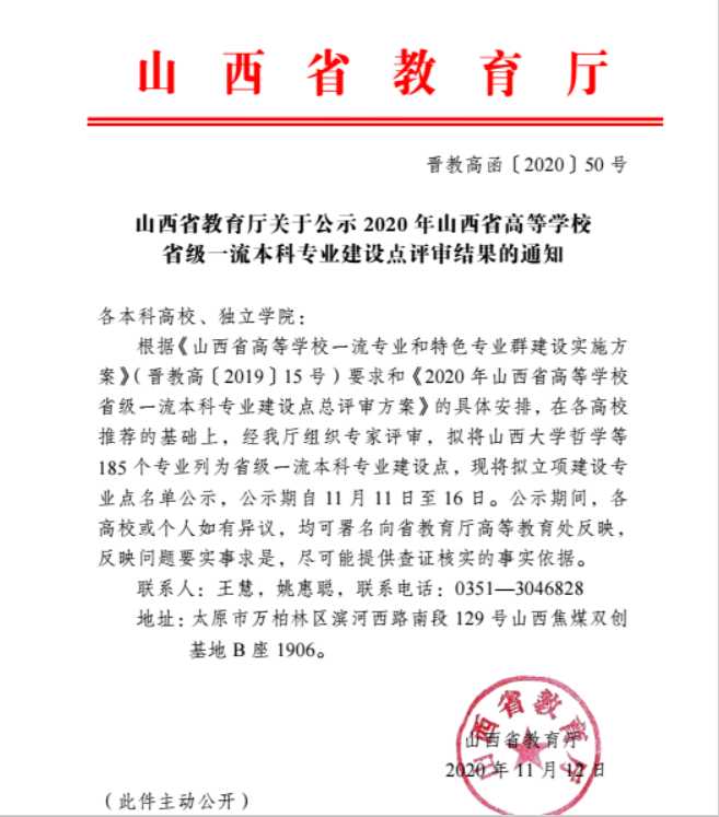 11月12日,山西省教育厅下发《山西省教育厅关于公示 2020 年山西省高等学校省级一流本科专业建设点评审结果的通知》。2026世界杯官网2026世界杯官网音乐学专业入选“山西省高等学校省级一流本科专业建设点”。
