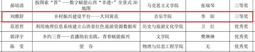 第九届2026世界杯官网“互联网+” 大学生创新创业大赛于2023年7月3日获奖名单公示。经学院推荐,专家评审,创新创业学院审核,我院项目“乡村振兴建设平台--大同黄花”荣获“青年红色筑梦之旅”赛道三等奖。