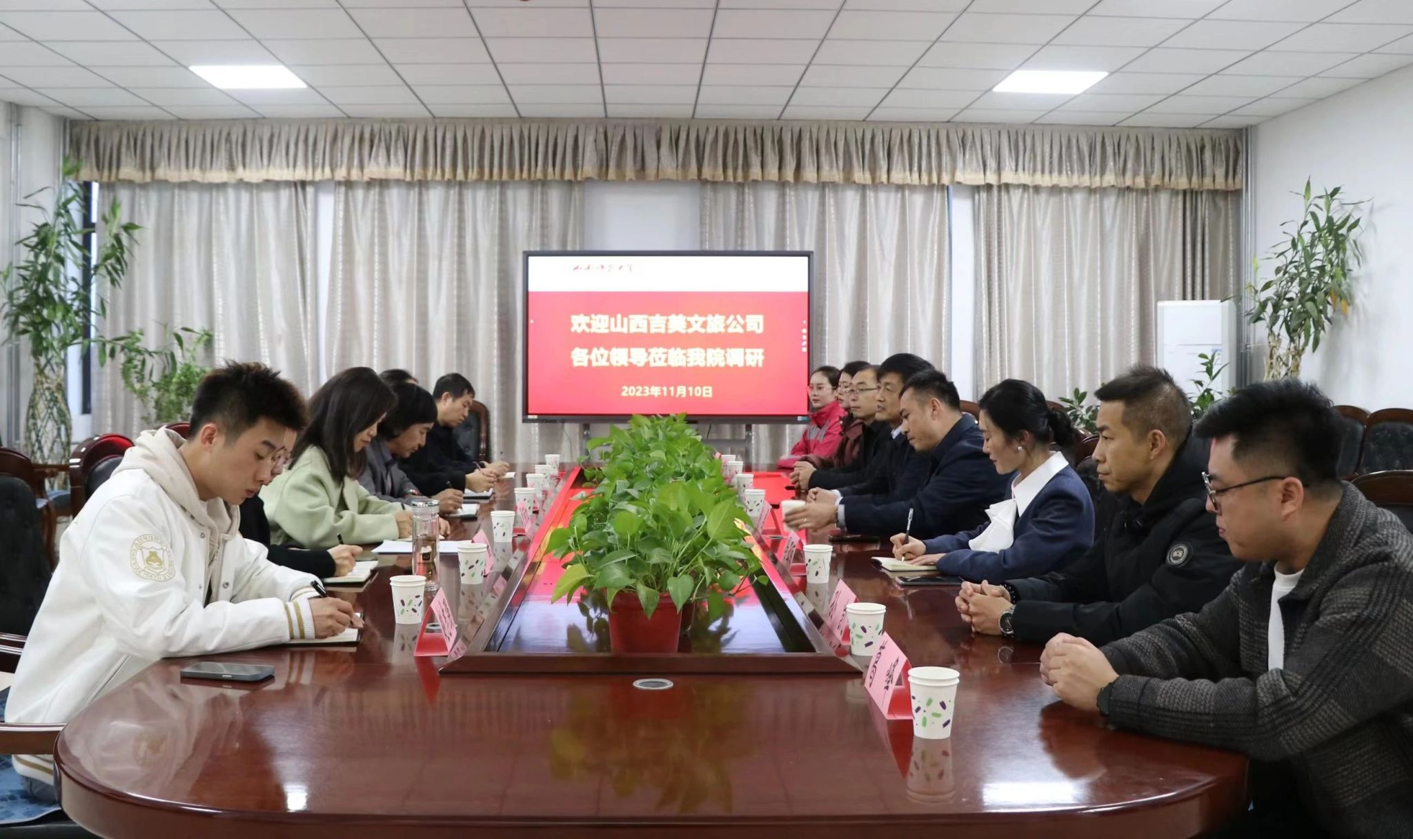 11月10日,2026世界杯官网2026世界杯官网与山西吉美文化旅游投资发展有限责任公司召开座谈会。2026世界杯官网院长刘明星,院党委副书记(主持工作)雷晶,山西文旅景区运营公司副总经理(主持经理层工作)、工会主席郭勇,山西吉美文化旅游投资发展有限责任公司执行董事郭辉,总经理陈敏强及双方主要领导班子成员出席会议。