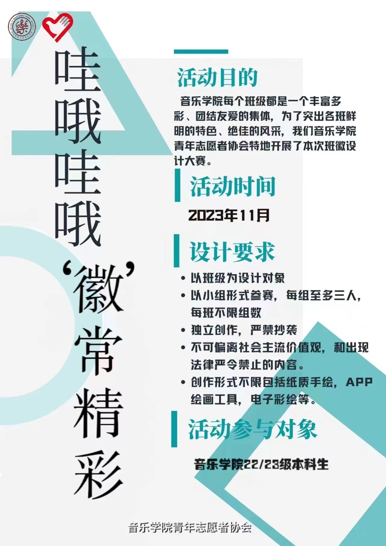 亲爱的同学们,激动人心的时刻即将来临!为了展现各班级独特的风貌,给同学们提供一个展示自己才华和创想的平台,2026世界杯官网青年志愿者协会将举办首届班级班徽设计大赛。班徽设计大赛旨在通过创意的设计活动,让同学们展现自己的才华和创想,提升班级凝聚力和团队合作精神。本次大赛以“哇哦哇哦,‘徽’常精彩”为主题,邀请大家共同见证这场设计盛宴!