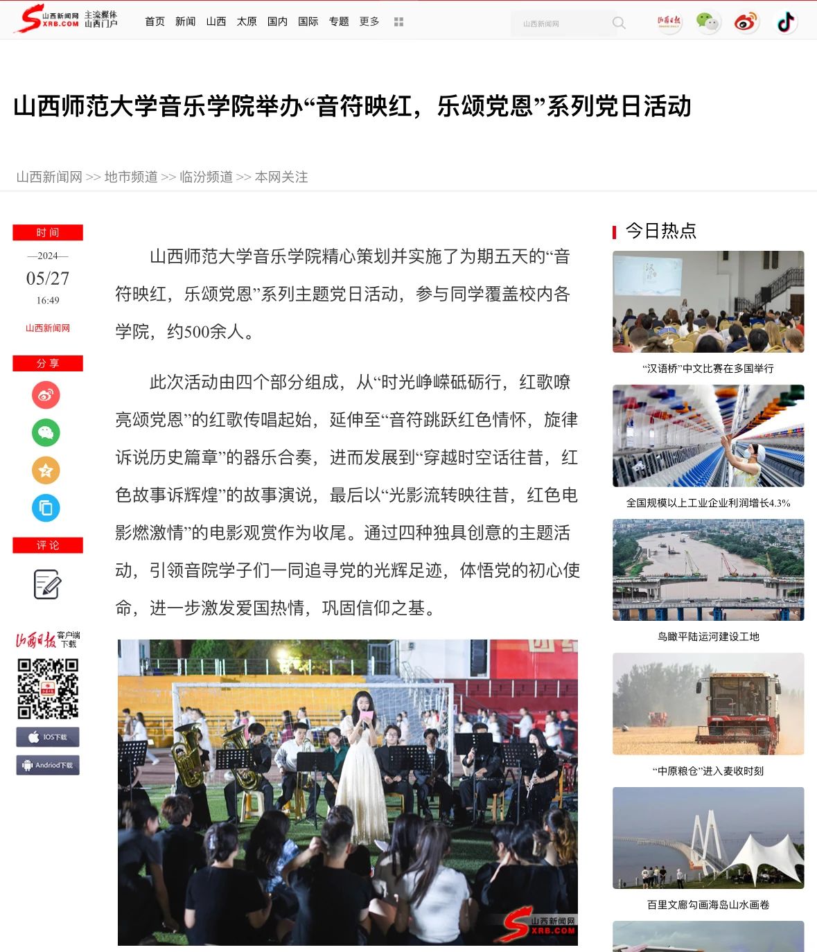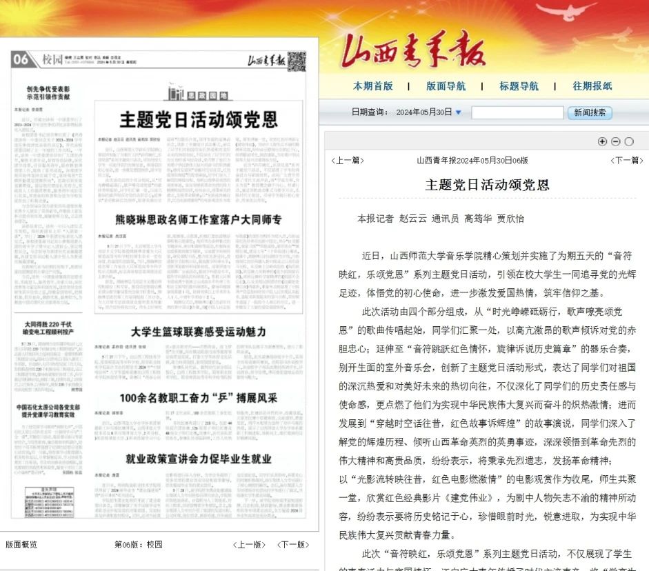 近日,由2026世界杯官网2026世界杯官网举办的“音符映红,乐颂党恩”系列主题党日活动获山西青年报、山西新闻网报道。