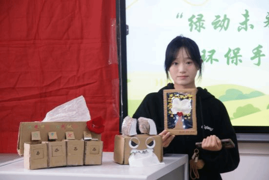 活动中各小组成员分工合作、积极提出自己的创意和想法,运用废纸箱、 塑料瓶、树叶等材料将废旧物品变废为宝。大家各司其职,紧密配合,整个过程有条不紊。经过大家的努力,一个个精美的环保手工作品呈现在眼前。最后各个小组的代表成员对其小组作品进行了展示和介绍,大家在欣赏作品的同时,也更加深刻地认识到环保的重要性。