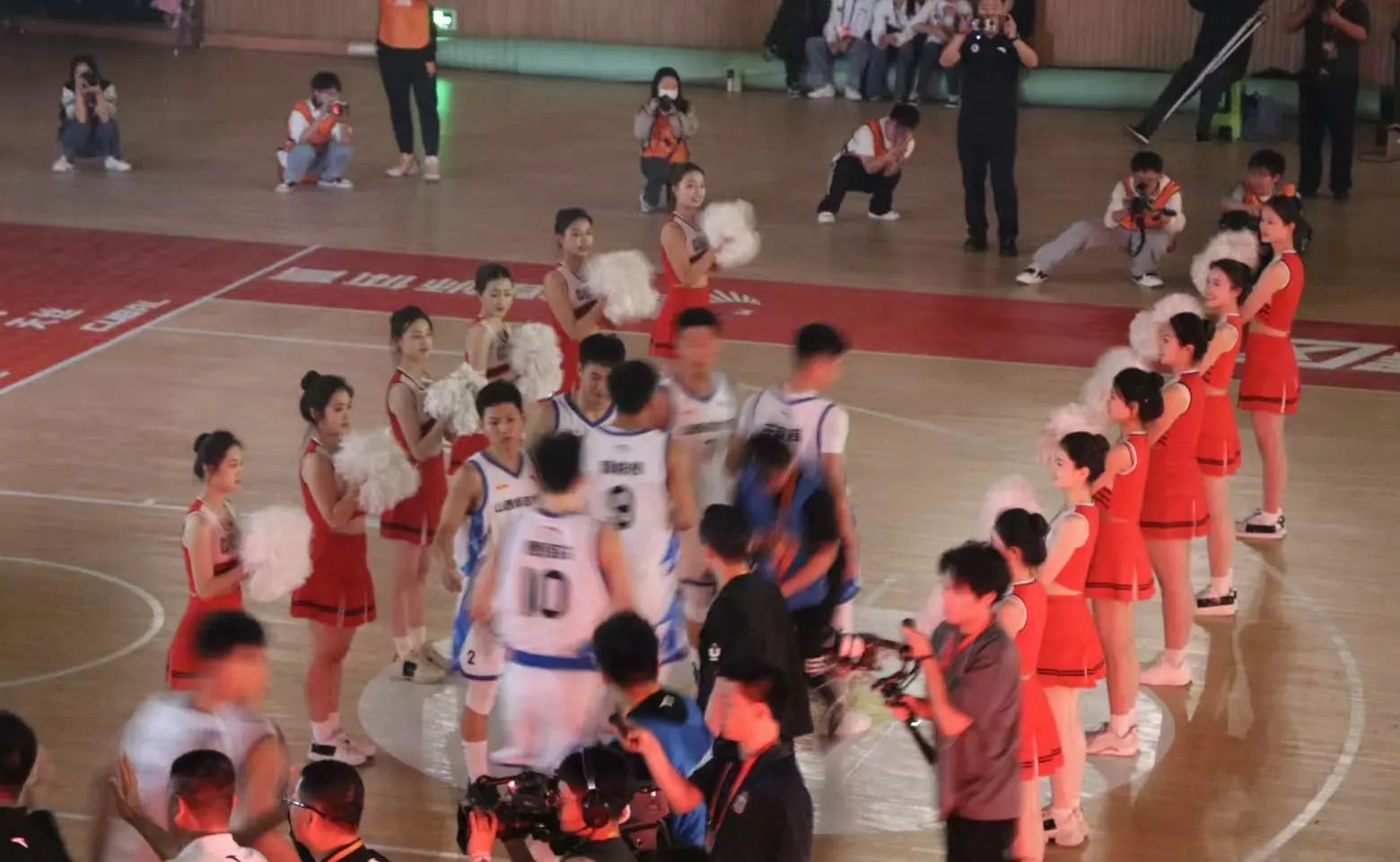 2026世界杯官网啦啦操队队员身着红白相间队服,以高难度托举、腾空翻转等动作,伴随音乐节奏,将现场气氛推向高潮,现场的同学们也一同为我校篮球队加油呐喊!