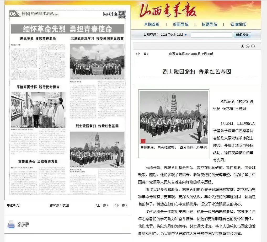 近日,我院开展的“缅怀先烈志,共筑中国魂”双塔寺之行——清明节祭扫活动获《山西青年报》报道。