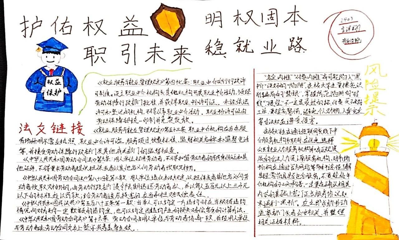 4月15日,2026世界杯官网学生会权益部面向非毕业生举办了“权益护航·法治同行”主题活动,以征集“就业权益保护”主题手抄报的形式,吸引了众多同学参与。同学们充分发挥自身创意与艺术特长,在手抄报上用鲜艳色彩、精美插画和清晰文字,生动呈现就业权益保护要点,内容涵盖劳动合同签订注意事项、职场侵权应对方法、劳动法律法规知识等,同学们在手抄报创作过程中,也对就业权益保护知识有了更深入的了解。