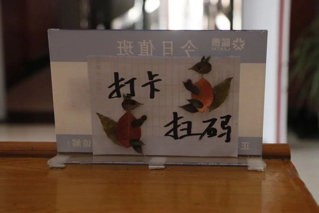 “打卡扫码”板上红枫叶小人攥着浆果笑盈盈的