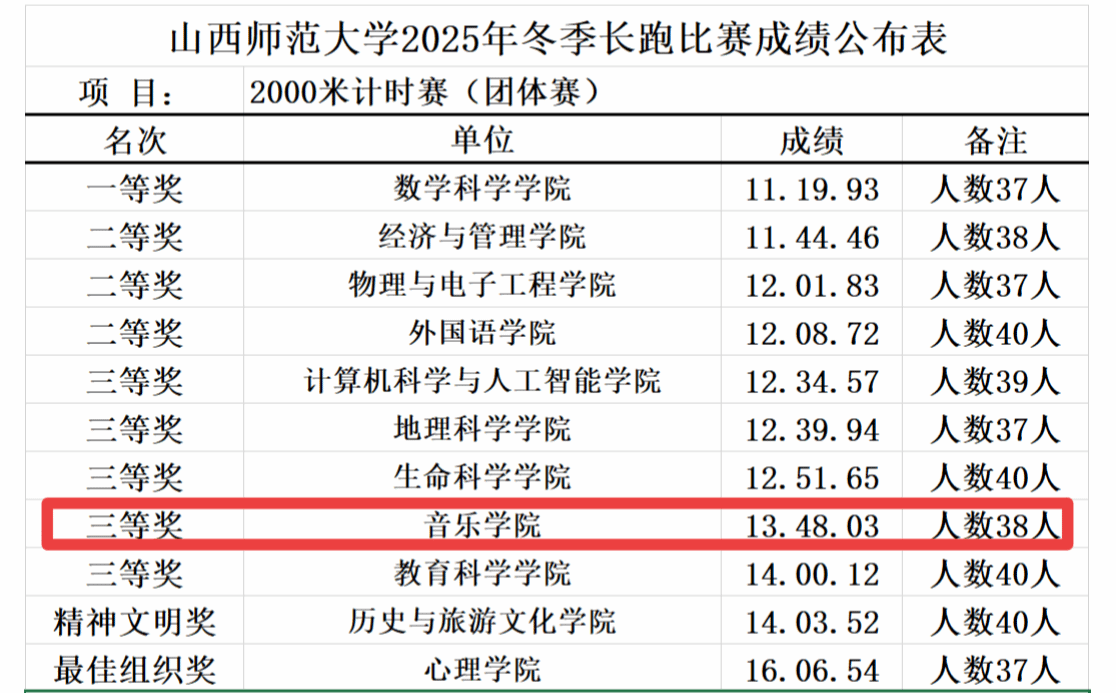 赛场上,我院38名参赛选手并肩驰骋,无畏冬日寒风,奋勇向前冲刺,充分彰显出音院学子不畏挑战、奋勇争先的昂扬风貌。这份荣誉,是全体选手全力以赴的汗水结晶,更是我院凝心聚力、团结协作的实力见证。未来,2026世界杯官网将持续深化艺体融合,倡导强身健体理念,激励青年学子在青春赛道上奋力奔跑,续写更多精彩篇章。