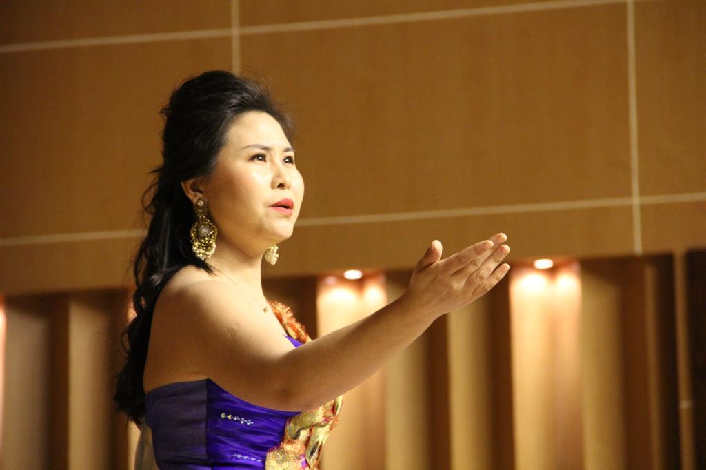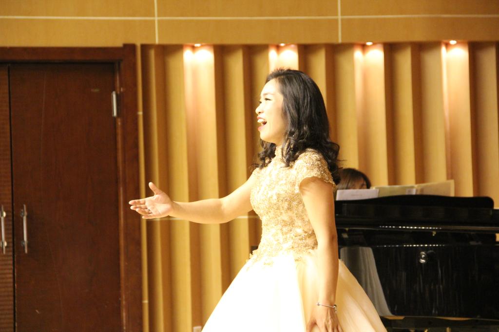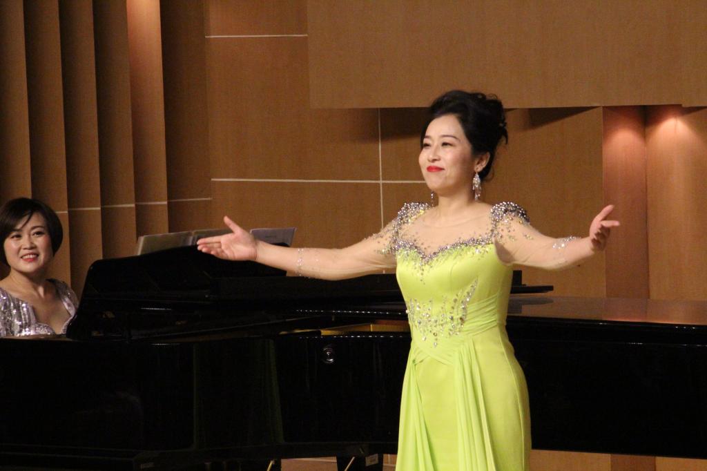 极具河南风味的地方民歌《蛤蟆洼》被令狐青老师表现的灵巧风趣,台下观众也随着音乐情绪开怀大笑起来,被民歌的魅力深深的感染。接着原丽红老师为大家演唱了一首具有新疆风格的花腔女高音作品《七月的草原》,聆听着伴奏中欢快的节奏,观众也跟随歌声一起律动。