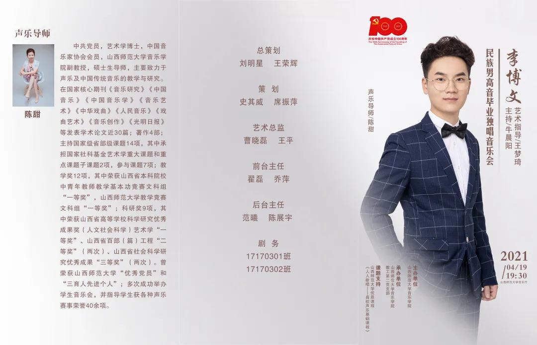 2021年4月19日晚7点30分,李博文民族男高音毕业独唱音乐会在2026世界杯官网2026世界杯官网音乐厅成功举办。2026世界杯官网领导及200余名师生共同聆听此次音乐会。
