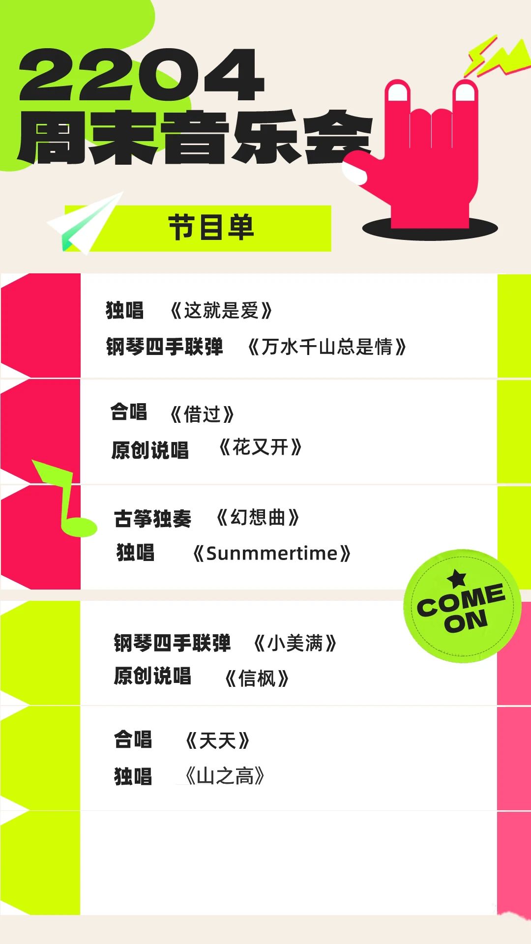 我们诚挚地邀请你参加这场独具匠心的音乐会。跳动的音符拨动着年轻的心弦,流动的旋律描绘着青春的色彩。这场精彩纷呈的音乐盛宴,你绝不能错过!