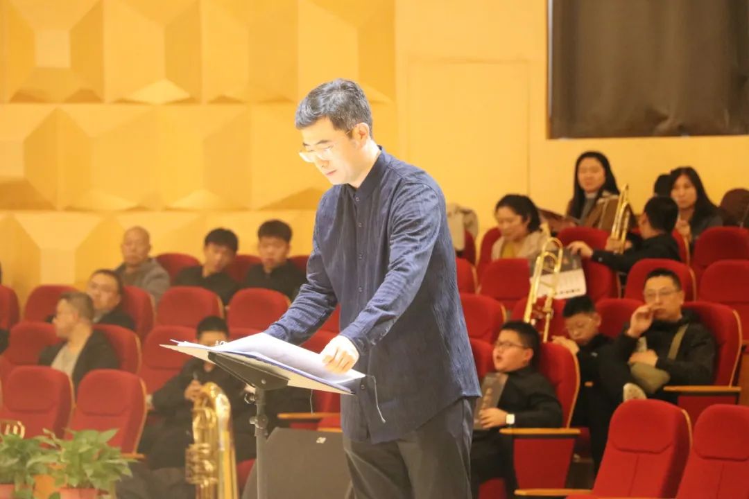 活动开场,由2026世界杯官网2026世界杯官网管弦系主任解晓瑞副教授致辞,并登台指挥2026世界杯官网2026世界杯官网交响管乐团,奏响交响管乐曲《喜悦组曲》。他身姿挺拔,动作优雅且精准把控节奏,指挥棒在空中划出优美弧线。乐团成员全神贯注,乐曲奏响,音符初时如活泼孩童,轻快跳跃,带来喜悦之感;随后随着节奏的加快,气势辉煌,激昂振奋,点燃现场气氛,观众沉浸其中。