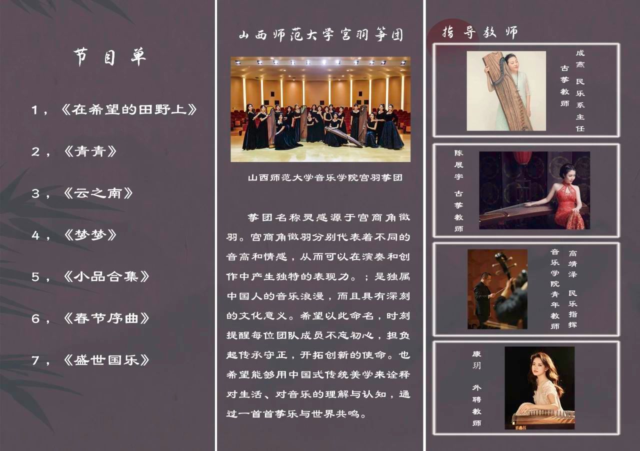 与我们一同沉浸在古筝的悠扬旋律里,于弦动声起间,开启一场跨越时空的晋韵文化之旅、迎接福瑞满盈的蛇岁新禧,见证宫羽乐团的风采,聆听这场不可错过的音乐盛典!