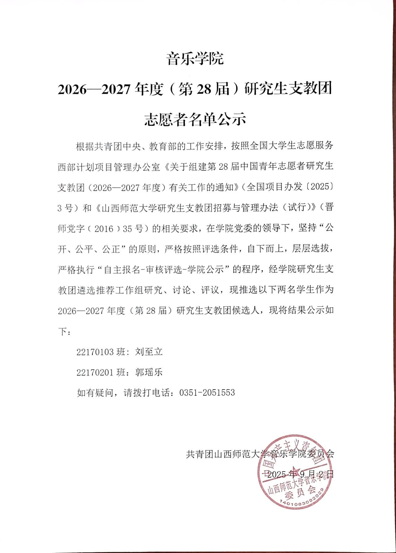 2026世界杯官网2026-2027年度(第28届)研究生支教团志愿者名单公示