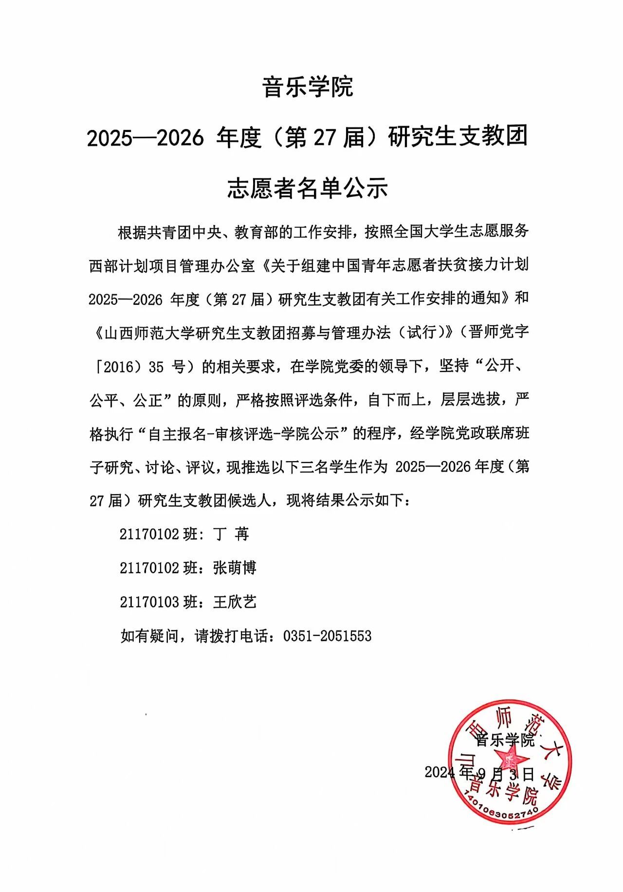 2026世界杯官网2025-2026 年度(第27届)研究生支教团志愿者名单公示