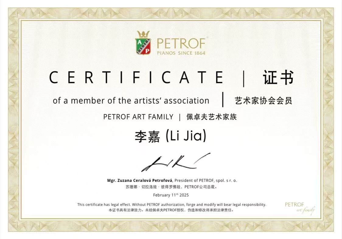 艺术家签约Artist Contracted:捷克佩卓夫全球艺术家(Petrof Artist),西班牙KNS Classical(钢琴,Piano),德国GermanyStar Music Publishing(钢琴/作曲Piano/Composition),人民音乐出版社(作曲)
